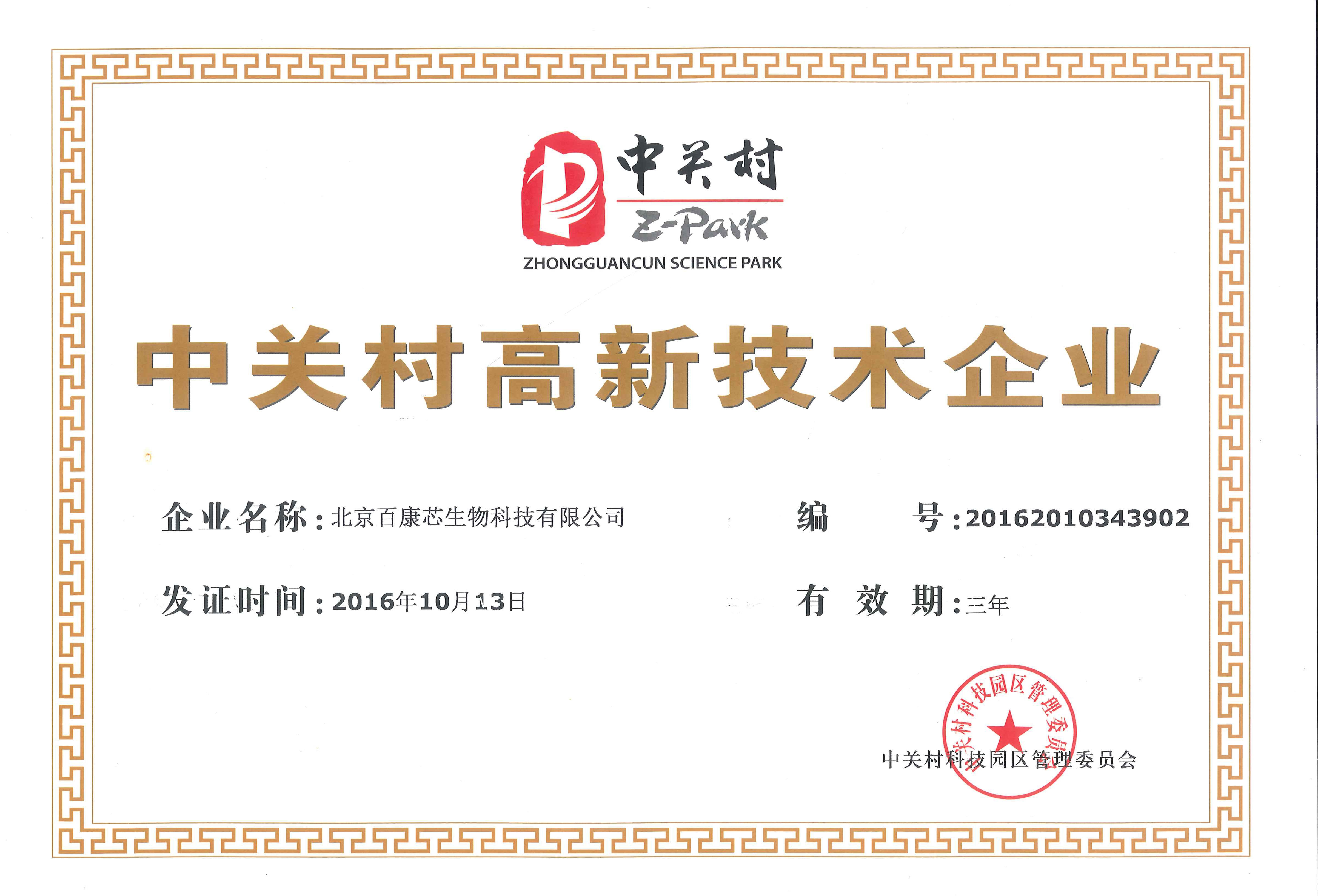 2016年10月14日,北京百康芯生物科技有限公司成功通過中關(guān)村高新技術(shù)企業(yè)認(rèn)定,正式榮獲由北京中關(guān)村科技園區(qū)管理委員會頒發(fā)的“中關(guān)村高新